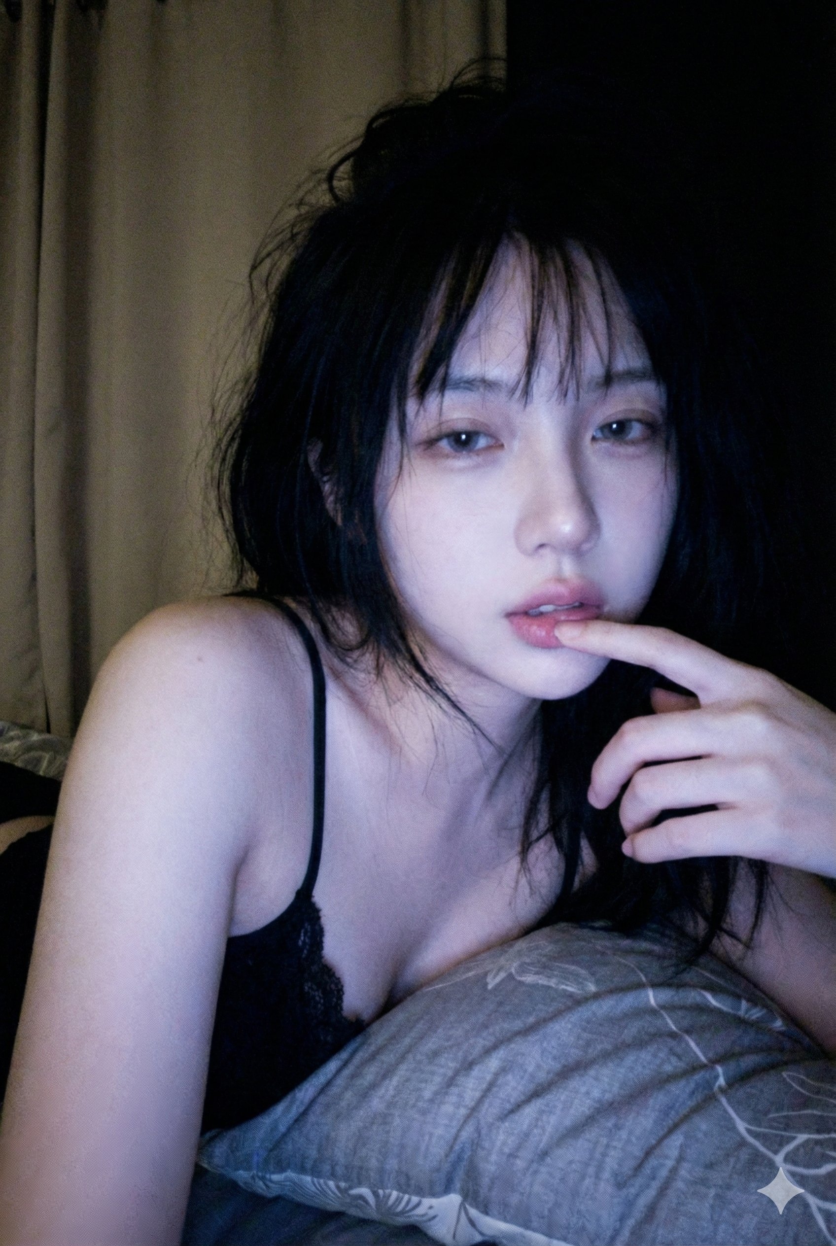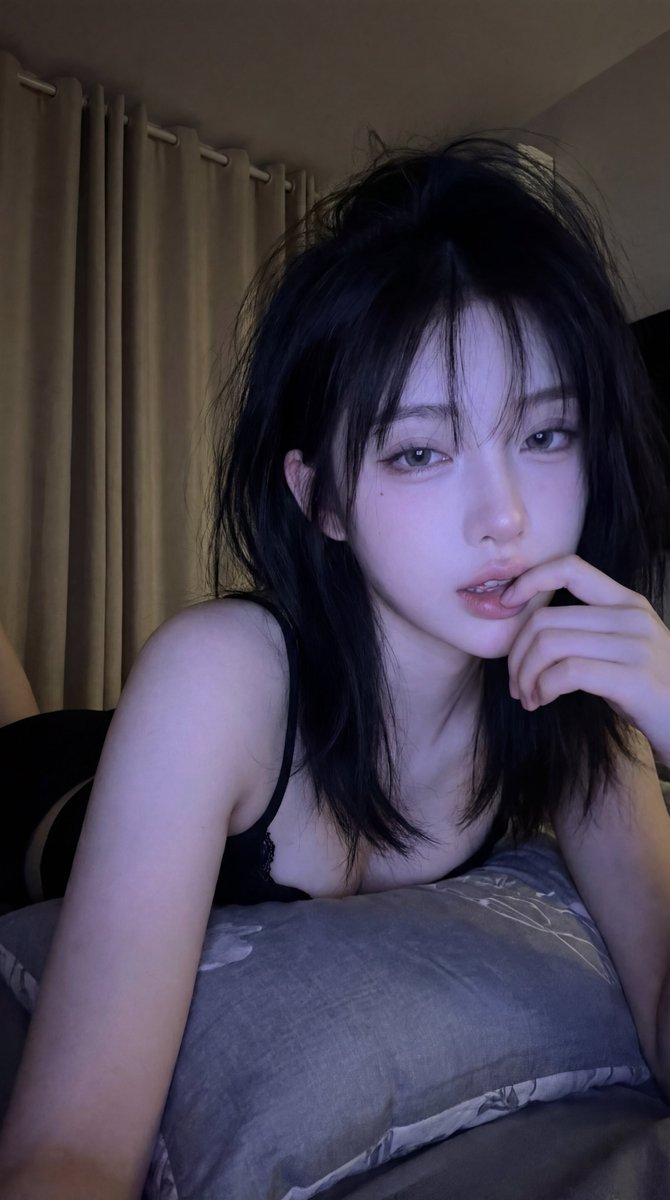 Close-up, slightly low angle. Subject lying on stomach, propped on a grey pillow with subtle pattern. Messy black bedhead hair with wispy bangs. Soft, dreamy/blank stare, mouth slightly open. Hand near face, index finger touching lowerlip.