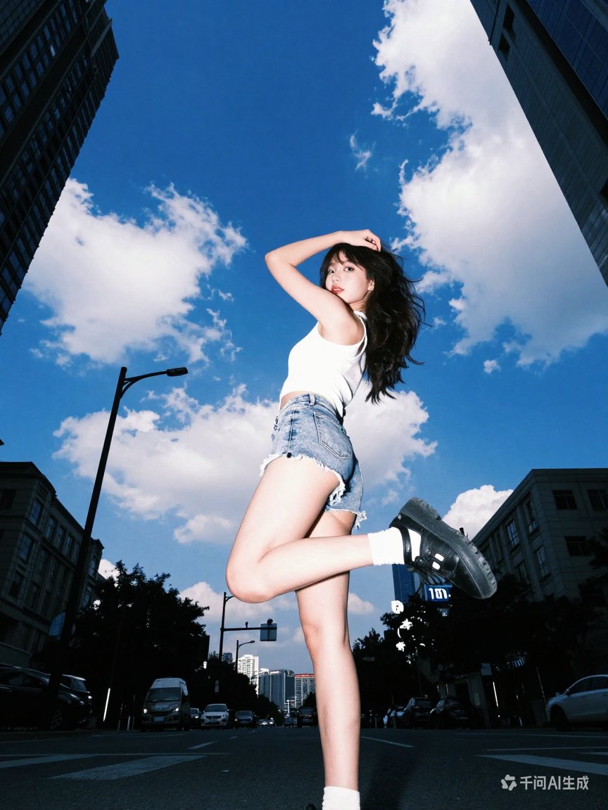 "composition": "极端低角度(蚯蚓视角),几乎垂直向上。使用16mm广角镜头扭曲透视,使被摄者抬起的脚和腿显得更大,被摄者在观者面前显得高大,从而加强姿势的俏皮气场与权威感。"