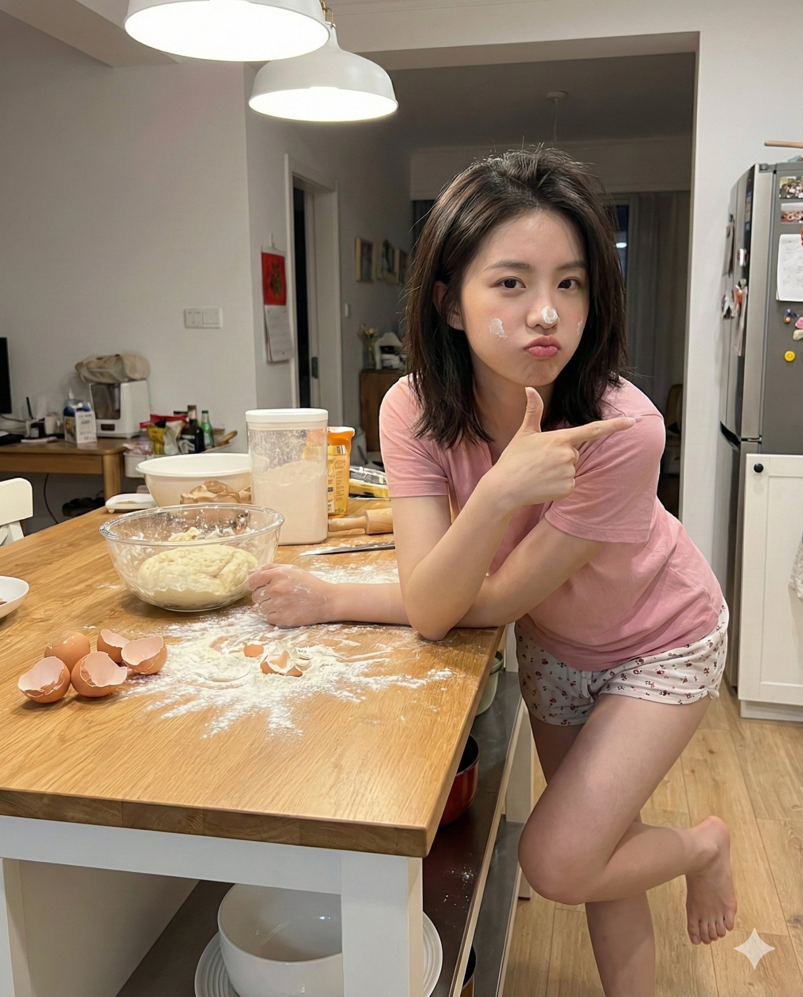 "style": "Playful, domestic, ultra-realistic, high detail on natural skin texture and flour dust, strict adherence to the reference photo for realism.",