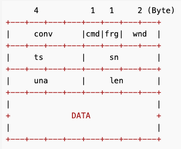 conv:会话编号。cmd:segment 类型,IKCP_CMD_ACK、IKCP_CMD_PUSH、IKCP_CMD_WASK、IKCP_CMD_WINS。frg:是否最后一个 segment。0:数据包的最后一个 segment;1:数据包的中间切片 segment。sn:下一个待发 segment 的序号。una:待接收消息序号,表示这之前的所有 segment 都收到了。len:segment 数据长度,不包含头。