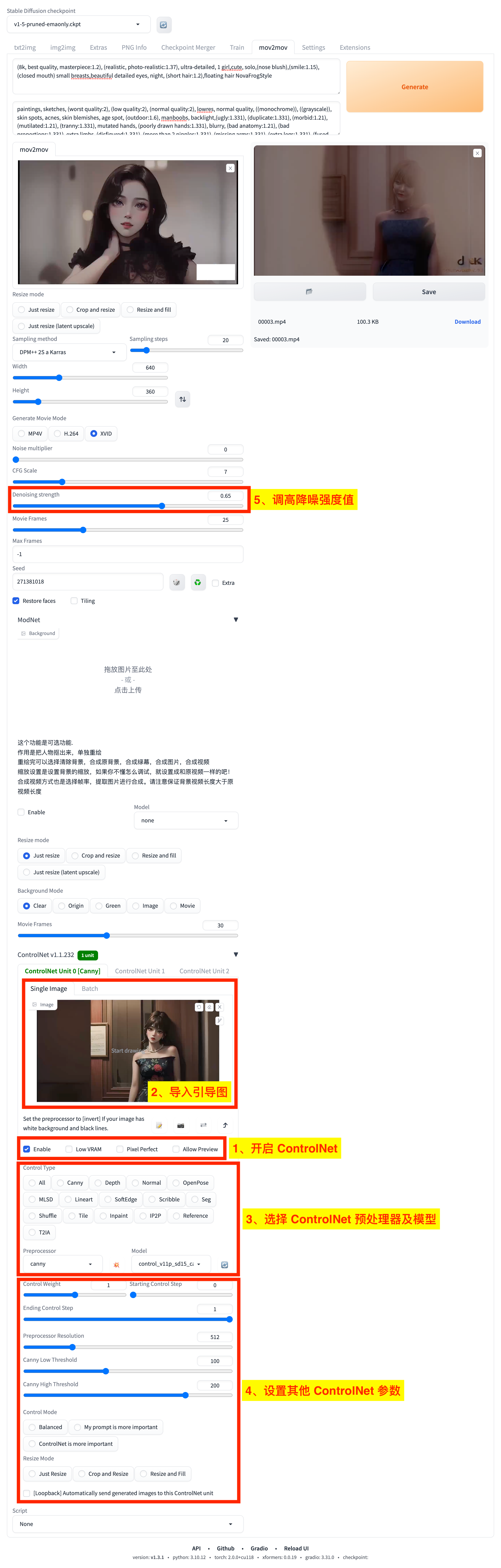 Mov2mov 功能还可以结合 ControlNet 来控制画面结构,相对于上面的流程,主要区别如图: